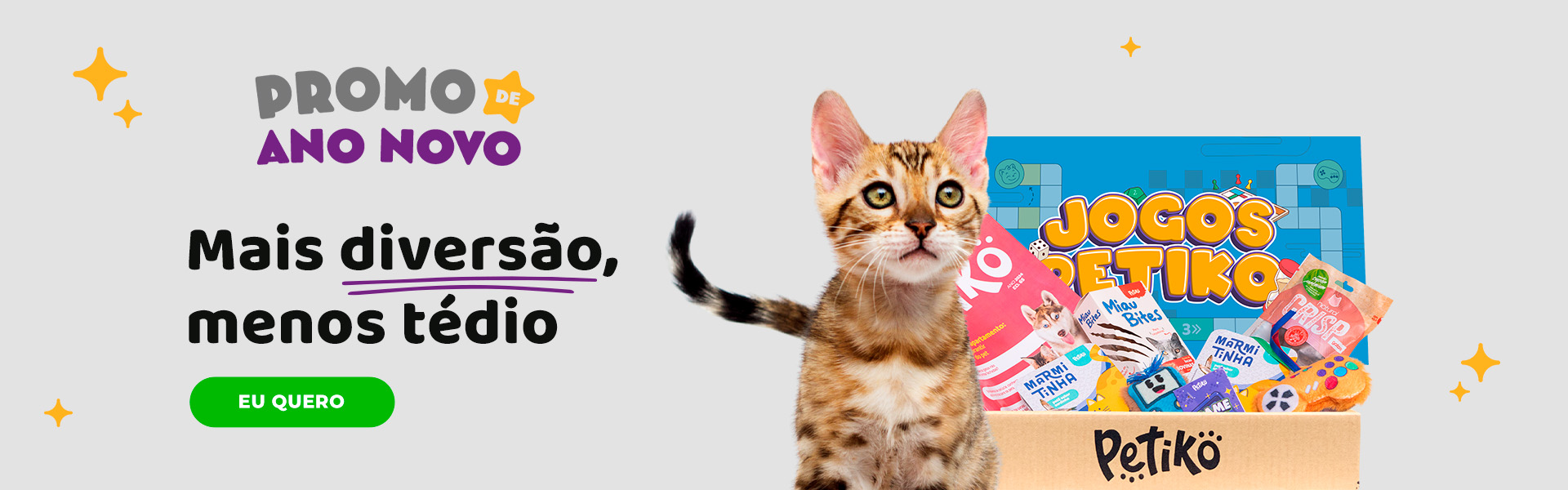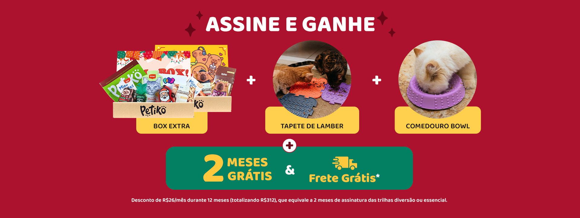 Se tem uma coisa que a gente entende, é o gosto refinado dos gatos. Por isso, o BOX.Petiko é feito para agradar até os felinos mais exigentes. Todo mês, seu gato recebe um BOX com tema diferente, recheado de brinquedos envolventes, alimentos úmidos deliciosos, petiscos selecionados, a revista Petiko e, dependendo da trilha escolhida, até areia biodegradável de mandioca.